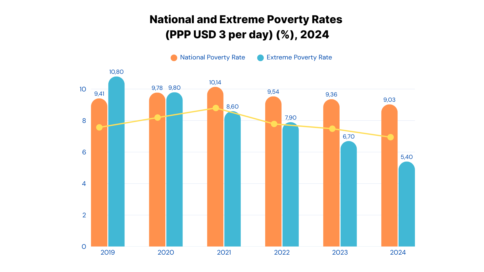 Tingkat kemiskinan nasional meningkat dari 9,41% pada 2019 menjadi 10,14% pada 2021 akibat pandemi, namun tren ini kembali menurun hingga 9,03% pada Maret 2024 dan 8,57% pada September 2024. Jika menggunakan garis kemiskinan internasional sebesar 3 dolar AS PPP (2021), angkanya bahkan turun dari 10,8% pada 2019 menjadi 5,4% pada 2024, atau setara dengan 15,42 juta jiwa yang masih hidup dalam kemiskinan ekstrem.