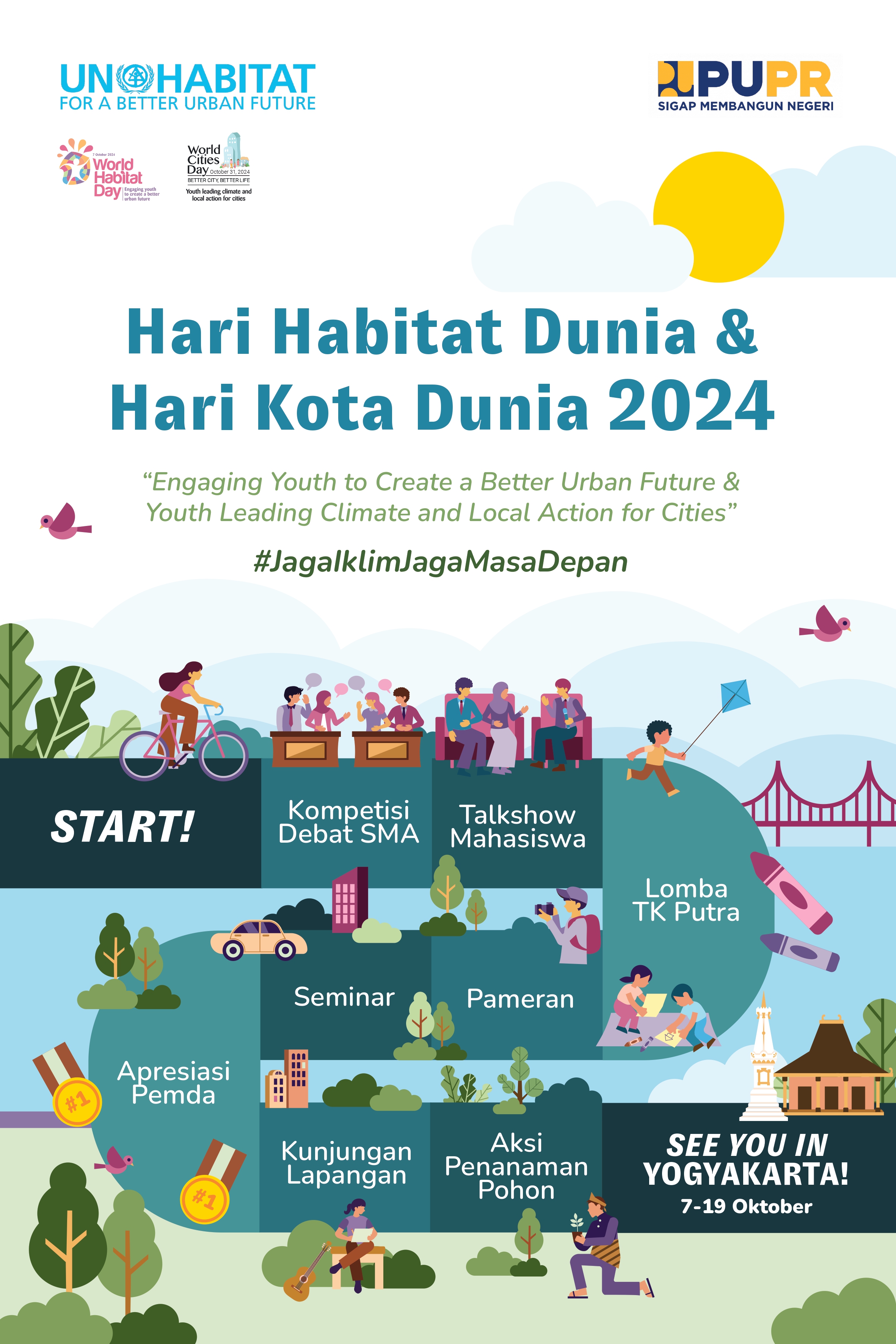 Kementerian Pekerjaan Umum dan Perumahan Rakyat sebagai instansi penjuru (focal-point) UN-Habitat di Indonesia melaksanakan Peringatan Hari Habitat Dunia - Hari Kota Dunia (HHD-HKD) yang jatuh pada bulan Oktober. Pada tahun 2024, Peringatan HHD-HKD mengusung tema Aksi Pemuda Jaga Iklim Jaga Masa Depan yang diangkat dari tema besar World Habitat Day dan World Cities Day dari UN-Habitat, yakni "Engaging youth to create a better urban future, Youth leading climate and local actions for cities".